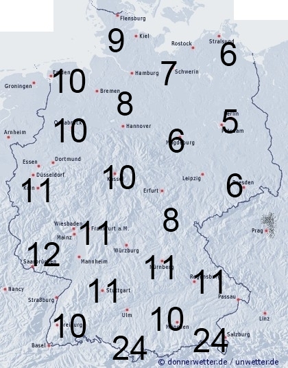 Während der Schneefall in Bayern nachlässt, zieht im Tagesverlauf von Westen neuer Niederschlag auf. Dieser geht jedoch bei einsetztender Milderung allgemein wieder in Regen über. Sonst entsteht Benetzung durch Feuchtigkeit wie Tau- oder Reifansatz. Die Benetzungsdauer liegt zwischen 5 und 7 Stunden im Nordosten und zwischen 8 und 12 Stunden im Rest unseres Landes. Bei einer vorhandenen Schneedecke können bis zu 24 Stunden erreicht werden.