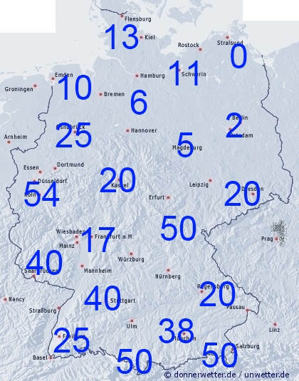 Die bis Montag 00 UTC zu erwartenden Niederschlagsmengen fallen wieder sehr unterschiedlich aus. Schon auf engstem Raum kann es wegen der auftretenden Schauer und Gewitter zu starken Schwankungen kommen. Bei den örtlich wütenden Unwettern können stellenweise sogar wieder Niederschlagsmengen zwischen 50 und 100 Liter pro Quadratmeter oder noch mehr fallen. Es drohen dann erneut Überschwemmungen und Schäden. Von den schweren Gewittern verschont bleiben in der Regel die nördlichen und nordöstlichen Teile unseres Landes. Vor allem ganz im Nordosten bleibt es vermutlich sogar trocken.