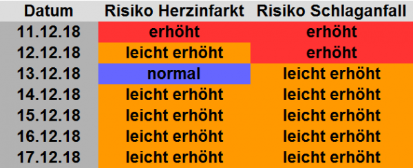 Die kommenden, teils feucht-kühlen Tage bergen für Risikopatienten meist leicht erhöhte bis erhöhte Schlaganfall- und Herzinfarktrisiken.