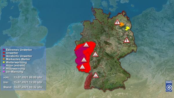 Hier die Warnkarte vom 13.7.2021/14.7.2021 auf unwetter.de mit den Warnungen von DWD: