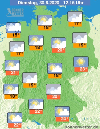 Die Temperturen bewegen sich zwischen 15 Grad an der Emsmündung und 24 Grad in, sowie rund um München.