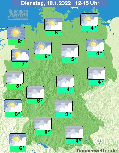 Heute Nachmittag bleibt es überwiegend dicht bewölkt, teils auch neblig-trüb. Gebietsweise sind aber auch Aufheiterungen möglich. Es bleibt landesweit trocken bei Werten von 3 Grad in Mittelfranken und bis 8 Grad im Rheinland.