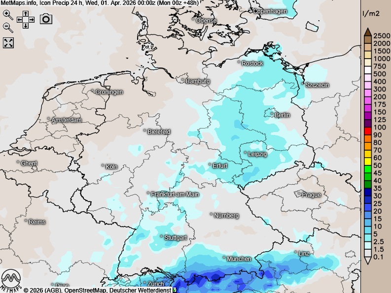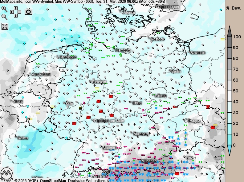 Die Temperaturen erreichen Höchstwerte um 2 Grad an den Alpen und um bis 12 Grad im Rheinland.