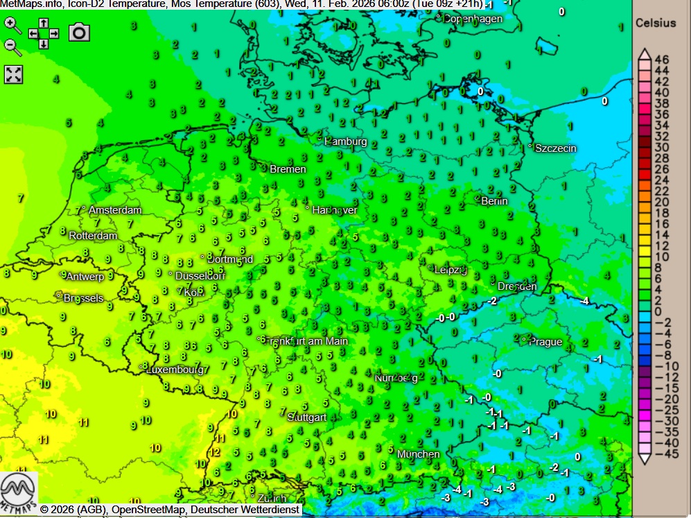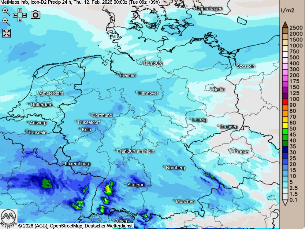 Die Wetter- und Temperaturkarte für Mittwochmorgen (06:00 Uhr) sowie die 24-Stunden-Regenmengen für Mittwoch nach ICON: