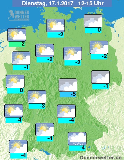 Die Temperaturen erreichen Höchstwerte um -5 Grad C im Thüringer Wald und um +2 Grad C in Ostfriesland.