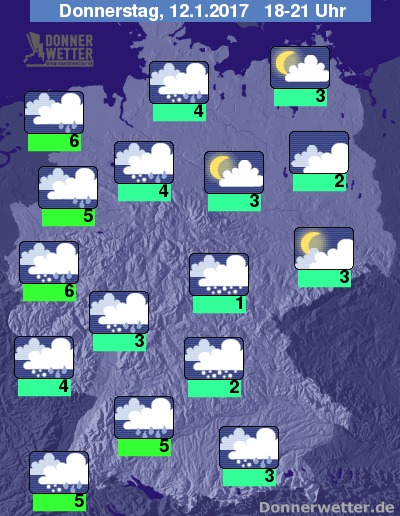 Die Höchstwerte liegen zwischen 1 Grad im Thüringer Bergland und 6 Grad an der Nordseeküste.