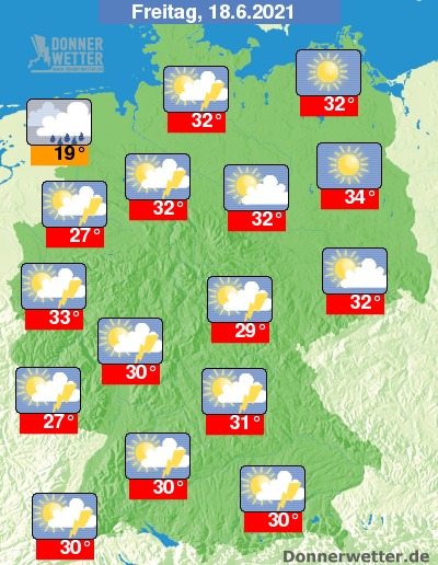 Am Freitag ist es nach Osten hin weiterhin heiter bis sonnig und weitgehend trocken. Besonders in den westlichen Landesteilen ziehen jedoch teils dichte Quellwolken auf und es können sich zum Teil kräftige Schauer und Gewitter entwickeln. Nach Osten hin wird das Schauer- und Gewitterrisiko insgesamt geringer. Die Temperatur steigt auf teils nur 19 Grad an der Nordsee und bis auf schwülheiße 33 Grad im Rheinland.