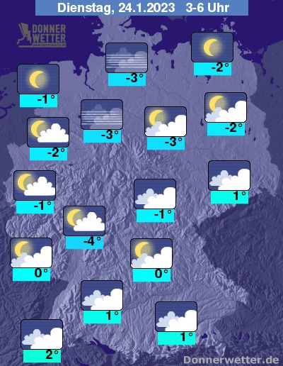 In der kommenden Nacht zeigt sich der Himmel über Norddeutschland oft sternenklar oder gering bewölkt. Weiter nach Süden hin ist es dagegen zunehmend stark bewölkt oder neblig-trüb. Es bleibt weitgehend trocken bei Tiefstwerten von 2 Grad in Freiburg und etwa -4 Grad in Wiesbaden.