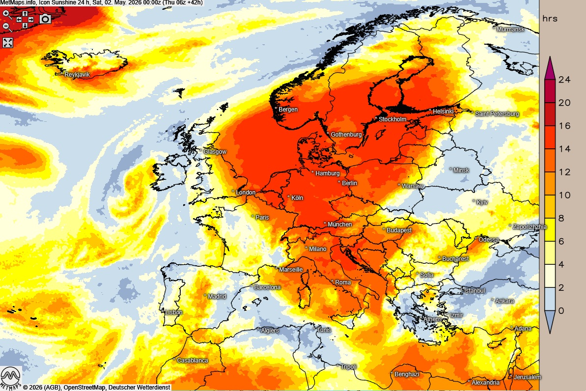 Die Wetter- und Temperaturkarten für 06:00 und 12:00 Uhr sowie die 24-Stunden-Sonnenscheindauer für Europa nach ICON: