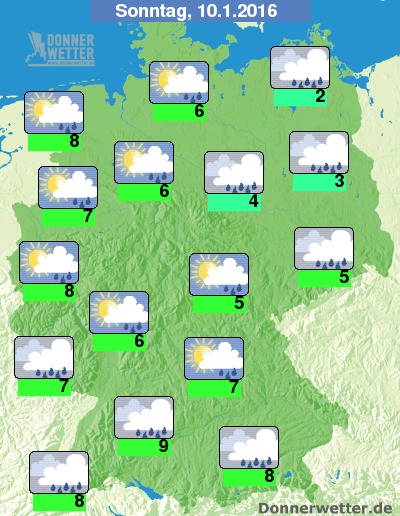 Am Sonntag ziehen verbreitet dichte Wolken durch, dabei ist es im Osten und Nordosten anfangs noch trocken, sonst fällt immer wieder, zum Teil auch langanhaltender Regen. Von Südwesten her lockert der Himmel aber bereits am Vormittag wieder auf und bis zum Abend klingt auch der Regen im Norden und Osten Deutschlands überwiegend ab. Im äußeren Süden bleibt es bei meist dichten Wolken und es fällt auch bis zum Abend zeitweise Regen. Die Temperatur steigt auf 2 Grad an der Müritz und bis 9 Grad in Stuttgart. Im Küstenumfeld weht ein teils starker Wind.