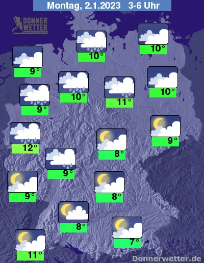 Am Montag ist es über der Nordwesthälfte Deutschlands bedeckt und es fällt dabei zeitweise Regen. Im Südosten ist es dagegen teilweise locker, sonst mehrheitlich stark bis dicht bewölkt, dabei bleibt es trocken. Die Temperatur erreicht 9 Grad in Wilhelmshaven und bis 14 Grad in Stuttgart.