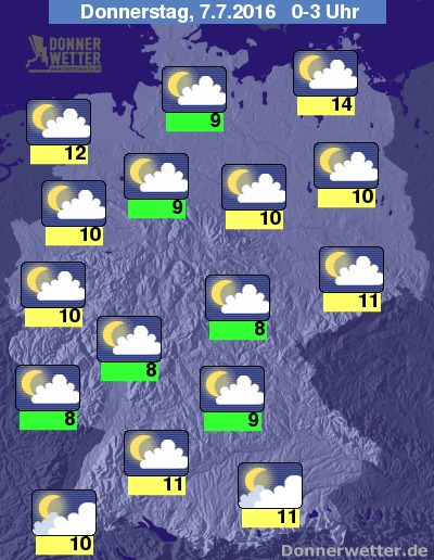 In der Nacht zeigt sich der Himmel über weiten Teilen des Landes zunächst noch locker bewölkt, bis zum frühen Donnerstagmorgen kann die Bewölkung in der Osthälfte dann phasenweise zunehmen.