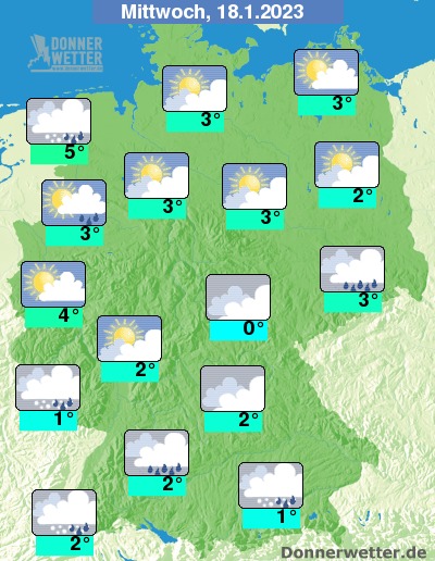 Am Mittwoch ist es über dem Norden und Westen oft heiter und trocken. Über dem übrigen Land ist es überwiegend stark bis dicht bewölkt, im Süden und Nordwesten und über Sachsen fällt Schnee oder Schneeregen, sonst bleibt es zumeist trocken. Die Temperatur steigt auf 0 Grad in Jena und bis 5 Grad in Bremerhaven.