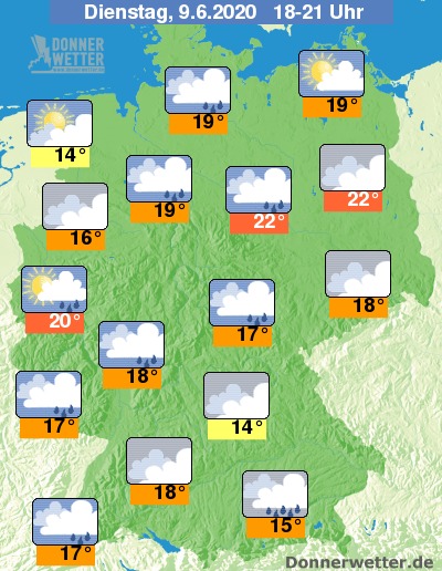 Am frühen Abend liegen die Temperaturen meist zwischen 14 und 19 Grad, in einer Zone vom Rheinland bis nach Brandenburg können stellenweise auch noch angenehmere 20 bis 22 Grad erreicht werden.
