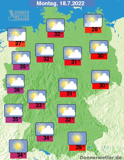 Heute zeigt sich das Wetter überwiegend heiter bis sonnig. Im Norden und Osten sind hier und da auch mehr Wolken unterwegs, dabei bleibt es aber trocken. Die Temperatur steigt auf 27 Grad im nördlichen Emsland und bis auf sehr heiße 36 Grad im Rheinland.