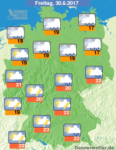 Über Schleswig-Holstein und dem Nordosten bleibt es den ganzen Tag wolkenverhangen und verregnet. Dabei können örtlich wieder über 50 Liter Niederschlag pro Quadratmeter fallen. Die Temperaturen liegen hier nur zwischen 16 und 19 Grad. Sonst ist es teils bewölkt, teils längere Zeit freundlich, Regen und Schauer halten sich abgesehen vom Alpenvorland in Grenzen. Die Temperaturen bewegen sich zwischen 18 und 23 Grad. Vor allem im Norden kann der Wind stark auffrischen.