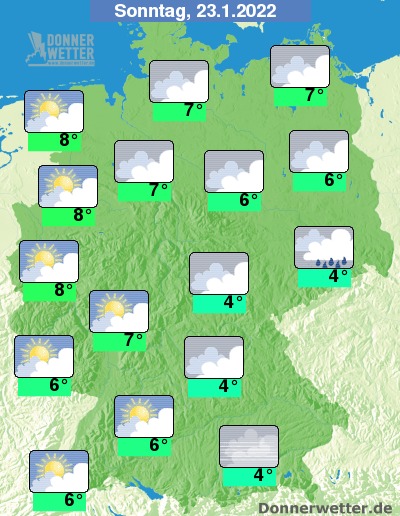Am Sonntag ist es zunächst landesweit bedeckt oder neblig-trüb, dabei bleibt es schon weitgehend trocken. Im Laufe des Tages lockert der Himmel über den westlichen Landesteilen oft auf. Die Temperatur steigt auf 4 Grad in Dresden und bis 8 Grad in Bonn.