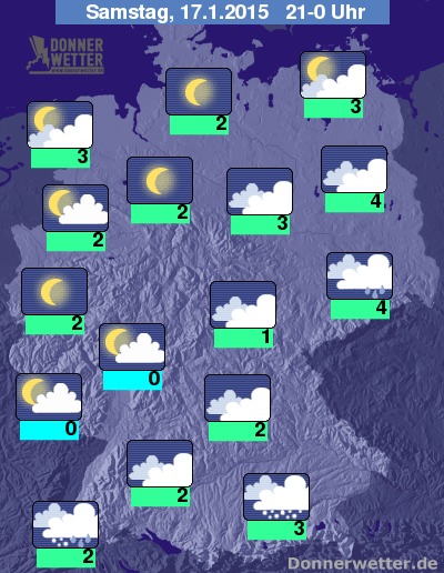 In der Nacht zum Sonntag fällt anfangs im Osten und Süden noch zeitweise Schnee, Schneeregen oder Regen, dabei kann es stellenweise glatt auf den Straßen sein. Nach Mitternacht klingen die Niederschläge hier jedoch nach und nach ab und teils lockert die Bewölkung auch etwas auf. In den anderen Landesteilen ist es dagegen häufig sternenklar oder nur locker bewölkt und trocken, in der zweiten Nachthälfte ziehen jedoch im Nordwesten des Landes dichte Wolken mit zeitweiligem Schnee, Schneeregen oder Schnee auf, dabei kann es ebenfalls teils sehr glatt werden. Die Temperatur sinkt auf 3 Grad an der Nordsee und bis -2 Grad am Alpenrand.