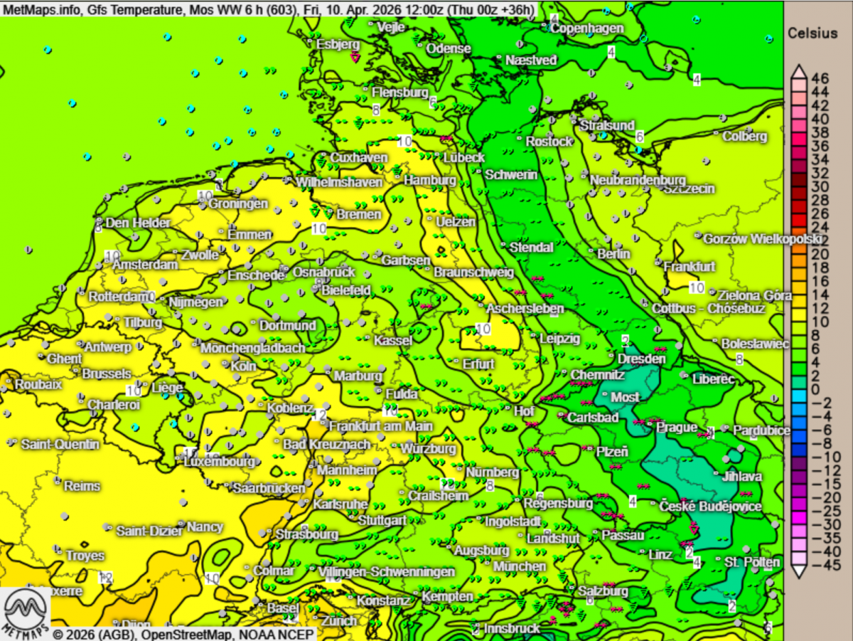 Wir müssen morgen besonders im Westen und Süden mit einem scharfen Temperaturrückgang rechnen. Teilweise macht das 10 Grad C aus. Heute nochmals 22-24 Grad C am Rhein, fast schon sommerlich. Arschkalt ist es im Osten- Berlin nur 4-5 Grad C