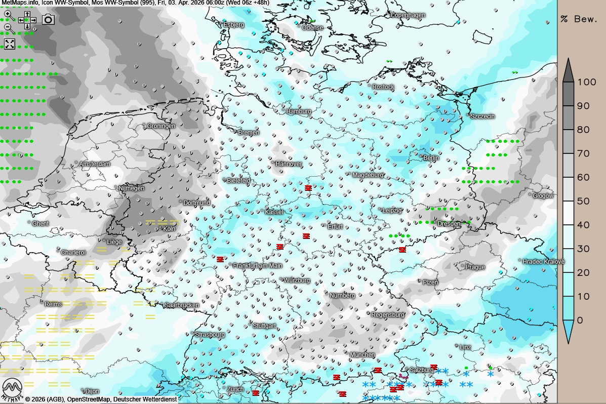 An Karfreitag bleibt es über weiten Landesteilen bei zunächst wechselnder Bewölkung trocken. Im Tagesverlauf nimmt die Bewölkung über dem Westen und Nordwesten zu, so dass es nachmittags meist bedeckt ist. Zum Abend setzt dann Regen ein.