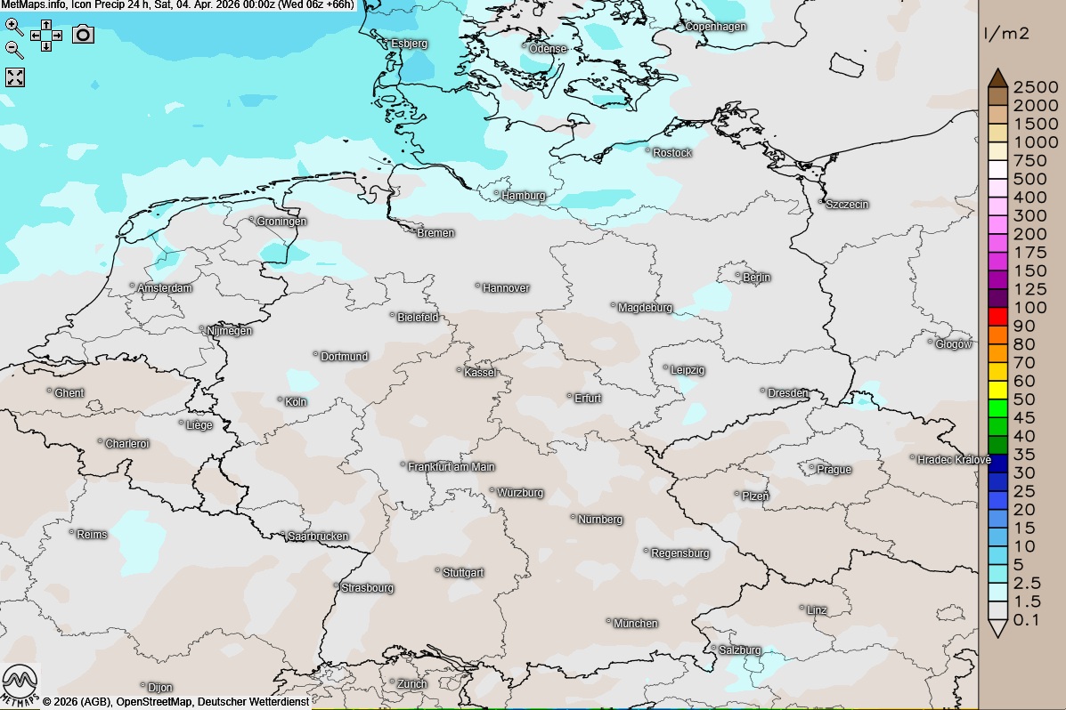 Die Wetter- und Temperaturkarte (06:00 Uhr / 15:00 Uhr) sowie die 24-Stunden-Regenmengen für Freitag nach ICON: