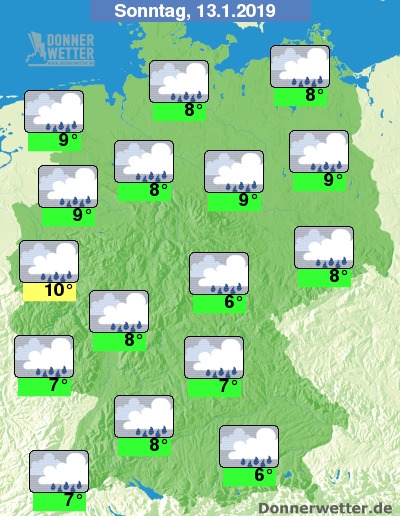 Am Sonntag halten sich dichte Wolken und es fällt immer wieder und auch langanhaltender Regen oder Nieselregen. Selbst an den Alpen fällt bis ca. 1000 m.üNN Regen oder Schneeregen, darüber weitgehend Schnee. Die Temperatur steigt auf mildere 6 bis 10 Grad.