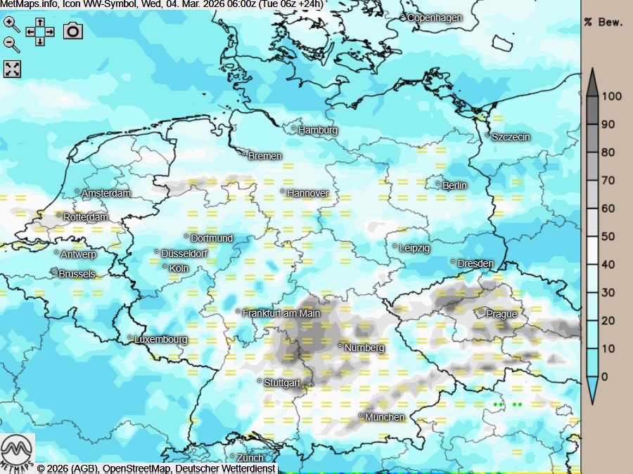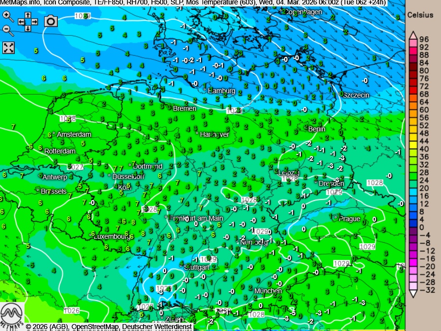 Die Strömungs- / Temperatur- sowie die Wetterkarte für Mittwochfrüh (06:00 Uhr) nach ICON: