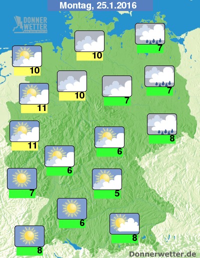 Am Montag halten sich im Norden und Osten meist dichte Wolken, dabei fällt vor allem am Vormittag noch zeitweise Regen oder Sprühregen. Im Süden und Südwesten ist es hingegen meist sonnig, zum Teil trüb, jedoch trocken. Im übrigen Bundesgebiet ist es wechselnd bewölkt und dazu trocken. Die Temperatur steigt auf 5 Grad in Mittelfranken und bis 11 Grad in der Kölner Bucht.