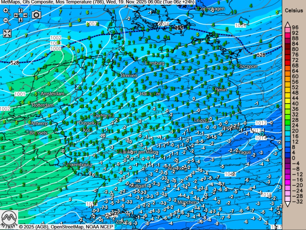 Die Temperaturen erreichen am Mittwoch Höchstwerte um 3 Grad im Norden Schleswig-Holsteins und um 7 Grad in Baden.