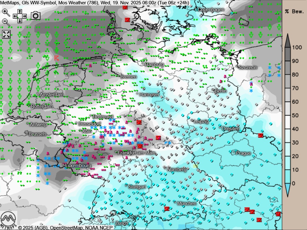 Am Mittwoch zeigt sich der Himmel über dem Süden und Südosten zunächst noch wechselnd bis aufgelockert bewölkt und es bleibt meist trocken. In den übrigen Landesteilen überwiegt zur Wochenmitte starke Bewölkung und es fällt immer wieder Regen. Im Norden und in Lagen über 300 bis 600 m fallen die Niederschläge als Schnee - Vorsicht Glättegefahr!