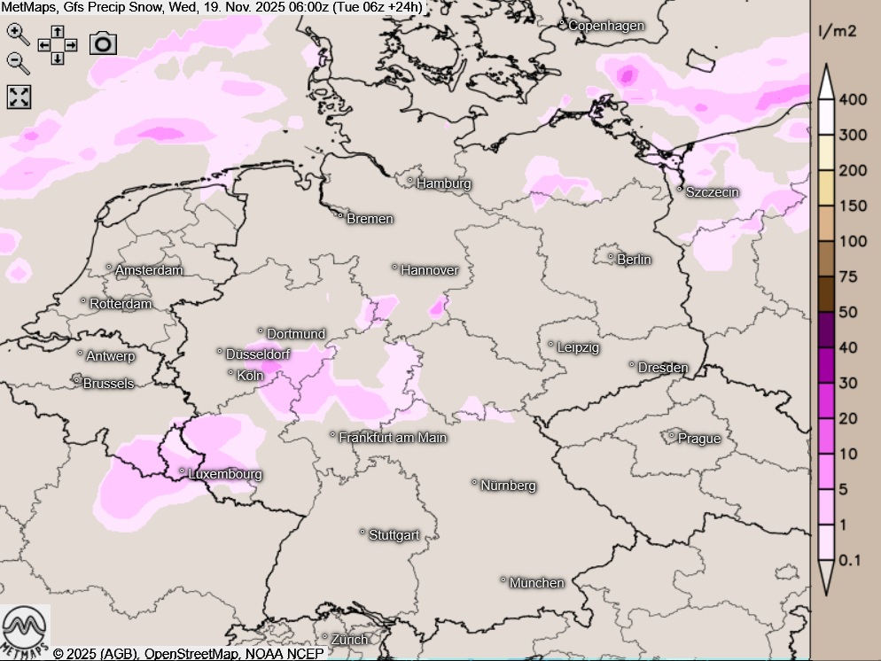 Die Strömungs-/ Temperaturkarte, die Wetterkarte sowie die Schneehöhen um 06:00 Uhr nach GFS: