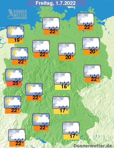 Am Freitag ist es oft stark bewölkt, Auflockerungen sind jedoch möglich. Es fällt gebietsweise Regen, der im Tagesverlauf von Westen her nach und nach abklingt. Im weiteren Tagesverlauf sind dann von Westen her wieder häufige Aufheiterungen möglich. Die Temperatur steigt auf frische 16 Grad in Jena und bis 25 Grad in Bonn.