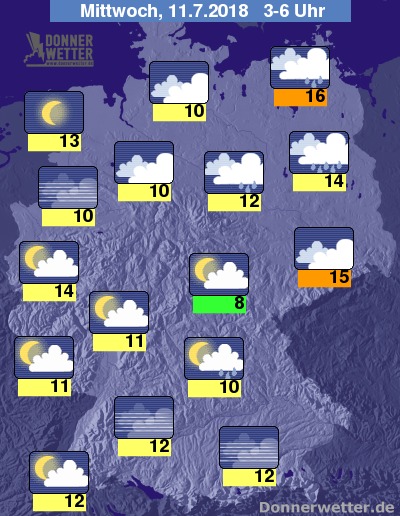 In der bevorstehenden Nacht ist der Himmel über dem Osten und Nordosten häufig dicht bewölkt und es fällt hier und Teil gewittriger Regen. Einzelne Schauer und Gewitter sind über dem Norden Bayerns möglich, sonst bleibt es bei lockerem bis sternenklarem Himmel verbreitet trocken. Die Temperatur sinkt auf 16 Grad an der Ostsee und bis 8 Grad im Eichsfeld.