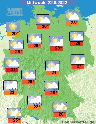 Am Mittwoch bleibt es über der Nordhälfte Deutschlands weitgehend heiter bis sonnig und trocken. Weiter nach Süden hin ist es hingegen häufig stark bewölkt und an den Alpen bilden sich gebietsweise, sonst nur vereinzelt Schauer. Die Temperatur erreicht 20 Grad in Cuxhaven und bis 31 Grad in Köln.