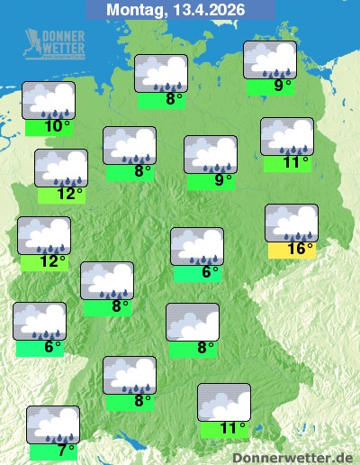 Am Montag ziehen zumeist dichte Wolken durch. Lediglich im Osten des Landes ist es zum Teil auch mal etwas aufgelockert bewölkt, hier fällt nur vereinzelt etwas Regen. Im übrigen Bundesgebiet fällt zeitweise Regen. Die Temperatur erreicht nur 6 Grad im Eichsfeld und immerhin bis 16 Grad in der Lausitz.