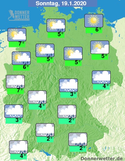Am Sonntag wechseln sich im norddeutschen Tiefland Sonne und Wolken im Tagesverlauf immer wieder ab, an der Ostseeküste scheint die Sonne auch länger von einem wolkenlosen Himmel. Mit Schauern muss im Norden aber trotzdem gerechnet werden. In den übrigen Landesteilen bleibt der Himmel meist bedeckt und immer fällt Regen, Schneeregen oder Schnee.