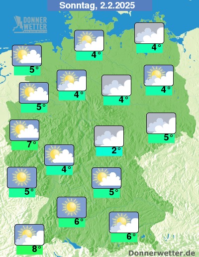 Am Sonntag zeigt sich der Himmel über weiten Teilen des Landes heiter bis wolkig; im Norden und Nordosten sowie in den Niederungen Süddeutschlands ist es heute auch stark bewölkt oder neblig-trüb, es bleibt aber meist niederschlagsfrei.