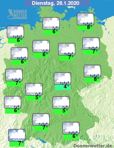 Abgesehen von kurzen Auflockerungen ziehen dichte, graue Wolkenmassen übers Land hinweg und bringen immer wieder Niederschlag, zum Teil schauerartig verstärkt und von Blitz und Donner begleitet. Dabei können sich zum Teil auch mal bis in tiefere Lagen herab Flocken oder Graupelkörner unter die Tropfen mischen. In höheren Lagen könnte sich zumindest mal vorübergehend eine winterliche Schneedecke bilden. Gegen Abend trocknet die Luft etwas ab und die Niederschläge werden seltener.