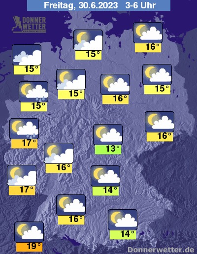 In der folgenden Nacht zeigt sich der Himmel über der Südosthälfte Deutschlands locker bewölkt und teils auch sternenklar. Von NRW, über Niedersachsen bis nach Schleswig-Holstein ziehen meist dichte Wolken durch und es bilden sich gebietsweise Schauer. Im übrigen Land bleibt es trocken bei Tiefstwerten von 19 Grad in Freiburg und etwa 13 Grad in Jena.