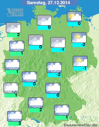 Am Samstag breitet sich das Schneefallgebiet noch weiter nach Osten und Süden aus, dabei ist zeitweise auch mit kräftigem und ergiebigem Schneefall zu rechnen. Regional ist auch Schneeregen oder Regen möglich. Dabei kann es gefährlich glatt auf den Straßen werden. Zusätzlich weht ein teils starker bis stürmischer Wind mit der Gefahr von Schneeverwehungen. Bis zum Abend erreicht der Schneefall etwa eine Linie vom südlichen Emsland bis zum Vogtland. Nordöstlich davon ist es zumeist stark bewölkt, vor allem im Nordosten und Osten ist aber zeitweise auch noch die Sonne zu sehen. Die Temperatur steigt auf frostige -2 Grad in der Uckermark und bis 3 Grad im Oberrheingraben.