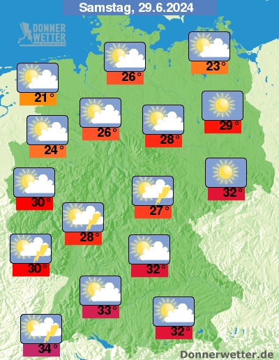 Die Temperaturen erreichen Höchstwerte um 21 Grad an der Nordseeküste und 34 Grad am Oberrhein.