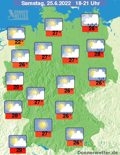 Heute Abend bleibt es im Süden weiterhin meist sonnig oder gering bewölkt. Weiter nach Norden hin ist es auch oft heiter, teils ziehen hier aber auch mehr und zum Teil dichte Wolken durch. In den östlichen Landesteilen besteht zudem ein leichtes Schauer- und Gewitterrisiko, sonst bleibt es weitgehend trocken. Die Temperatur liegt bei 22 Grad in Cuxhaven und 29 Grad in Freiburg.