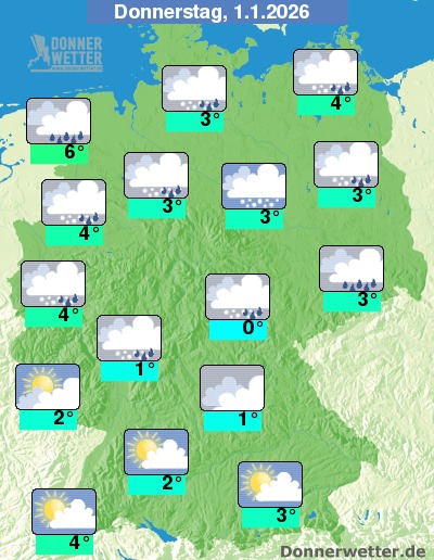 Am Donnerstag bleibt es südlich des Mains oft heiter oder sogar sonnig, hier bleibt es trocken. Im übrigen Bundesgebiet ist es zumeist bedeckt, dabei fällt zeitweise Schnee oder Schneeregen, besonders im Norden eher Regen oder Schneeregen. Die Temperatur steigt auf 0 Grad in Erfurt und bis 6 Grad in Cuxhaven. Über der Nordhälfte ist es oft stürmisch, an der See herrscht verbreitet Sturm.