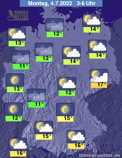 In der bevorstehenden Nacht ist der Himmel zum Großteil locker bewölkt oder sternenklar, über dem südlichen Bayern halten sich anfangs gebietsweise dichte Wolken, die zu Schauern und örtlichen Gewittern führen können. Im übrigen Bundesgebiet bleibt es weitgehend trocken. Die Temperatur sinkt auf 17 Grad in Dresden und 11 Grad in Münster.