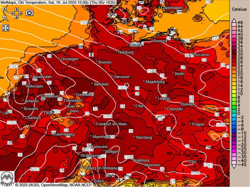 Am Samstagnachmittag zeigt sich der Himmel über weiten Teilen des Landes heiter oder die Sonne scheint von einem wolkenlosen Himmel. Im Süden und Südwesten steigt am Nachmittag und Abend das Schauer- und Gewitterrisiko, lokale besteht Unwettergefahr..