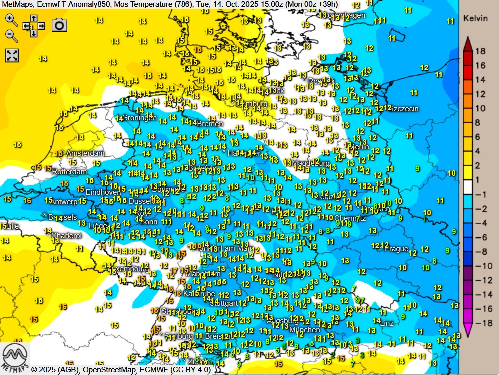 Die Temperaturen und die Temperaturabweichung sowie die Wetterkarte für Dienstagnachmittag (15:00 Uhr) nach Ecmwf: