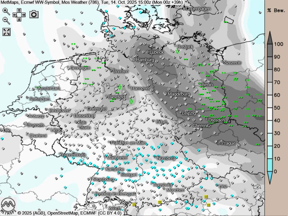 Am Dienstagnachmittag zeigt sich der Himmel über dem Süden heiter bis wolkig und es bleibt trocken. In den übrigen Landesteilen überwiegt am Nachmittag starke Bewölkung oder es ist nebelig-trüb, dabei fällt vor allem im Norden und Osten zeit- und gebietsweise etwas Regen oder Sprühregen.