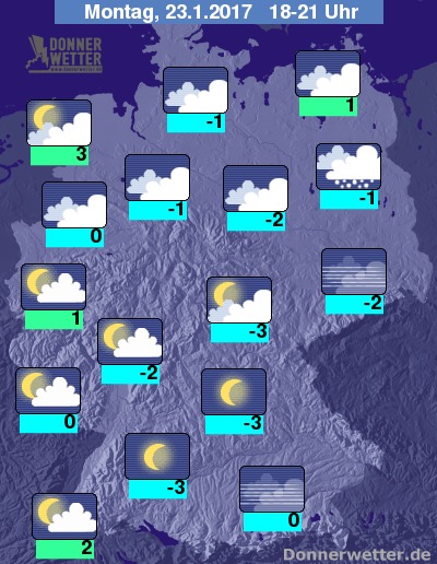 Heute Abend bleibt der Himmel im Süden meist sternenklar oder nur locker bewölkt, über der breiten Mitte ist es teils aufgelockert, oft jedoch schon stärker bewölkt, jedoch weitgehend trocken. Im Norden, Nordosten und auch bis weiter nach Sachsen ist es größtenteils dicht bewölkt, dabei ist auch etwas Schnee möglich. Die Abendwerte liegen bei -3 bis 3 Grad.