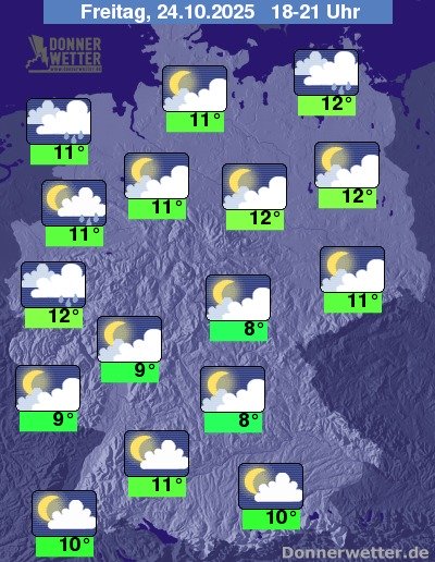 Heute Abend zieht meist aufgelockerte oder starke Bewölkung über Deutschland hinweg, dazu bilden sich vor allem vom Westen, über den Nordwesten bis in den Nordosten einzelne Schauer, im übrigen Land ist es weitgehend trocken. Im Süden zeigt sich der Himmel auch verbreitet nur gering bis locker bewölkt. Zudem weht ein starker, vor allem im Norden und Westen teils stürmischer Wind. An der Nordsee sind Sturmböen möglich. Die Temperatur liegt bei 8 Grad in Eisenach und etwa 12 Grad in Berlin.