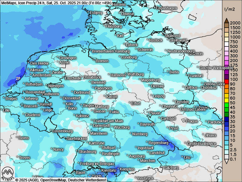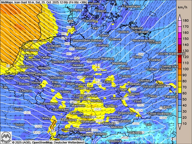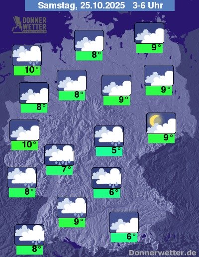 In der Nacht zum Samstag ziehen von Nordwesten her überwiegend dichte Wolken hinweg und es fällt zeitweise Regen oder es bilden sich einzelne, teils kräftige Schauer. Der Wind weht weiterhin oft stark, zum Teil auch stürmisch. An der Nordsee sind lokal Sturmböen möglich. Die Temperatur sinkt auf 10 Grad im Rheinland und bis 5 Grad in Mittelfranken.
